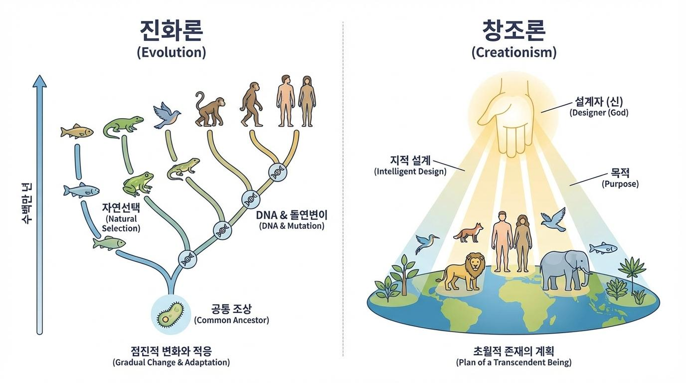 우리는 과연 어디에서 왔을까요? 우리가 존재하게 된 이유와 생명의 기원에 대한 물음은 인류가 오랫동안 품어온 가장 근원적인 궁금증입니다. 이 심오한 질문은 과학과 종교라는 두 갈래의 답을 제시하며 깊은 논쟁을 불러일으켰습니다. 바로 진화론과 창조론이라는 두 가지 관점입니다. 이 둘은 마치 평행선처럼 서로 다른 길을 걸으며 오랜 세월 동안 치열한 논쟁을 이어왔습니다. 오늘날에도 이 논쟁은 여전히 현재진행형이며, 우리는 이 두 관점이 무엇을 주장하고 왜 충돌하는지 이해함으로써 생명의 신비에 한 걸음 더 다가갈 수 있습니다.