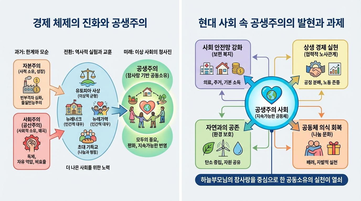 이러한 한계를 넘어, 진정한 이상 사회의 경제적 측면을 제시하는 것이 바로 공생주의입니다. 공생주의는 하늘부모님의 참사랑을 기반으로 하는 '공동소유'를 의미합니다. 이는 특정 개인이나 집단이 모든 것을 독점하는 것이 아니라, 모두가 필요한 만큼 생산하고 공정하게 분배하며, 전체의 목적을 위해 합리적으로 소비할 수 있는 환경을 지향합니다. 마치 부모가 자식에게 균등한 환경과 평등한 생활 조건을 주려 하는 것처럼, 모든 인류에게 그러한 조건이 주어져야 한다는 근본적인 가르침에 뿌리를 두고 있습니다.