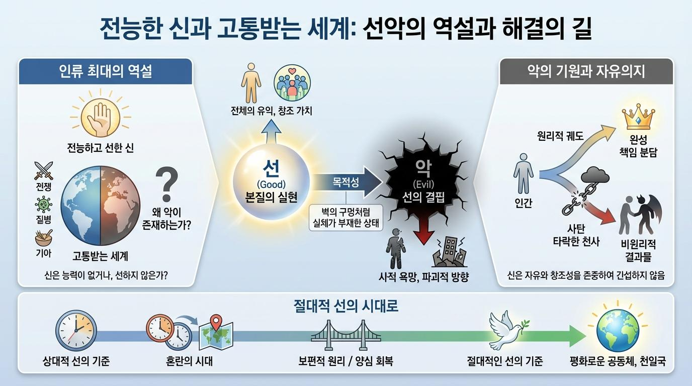 인류의 역사는 끊임없는 선과 악의 투쟁사였습니다. 하지만 신은 인간을 로봇처럼 조종하여 악을 제거하는 것이 아니라, 인간 스스로가 자유의지와 책임을 통해 악을 극복하기를 기다려 오셨습니다. 악은 단순히 물리적인 힘으로 정복되는 것이 아니라, 더 큰 선의 힘으로 그 근본 뿌리를 치유할 때 비로소 소멸합니다. 우리가 일상에서 이기심을 버리고 공적인 가치를 실천하는 모든 과정이 곧 악의 판도를 줄이고 선의 영역을 넓히는 숭고한 복귀의 과정입니다.