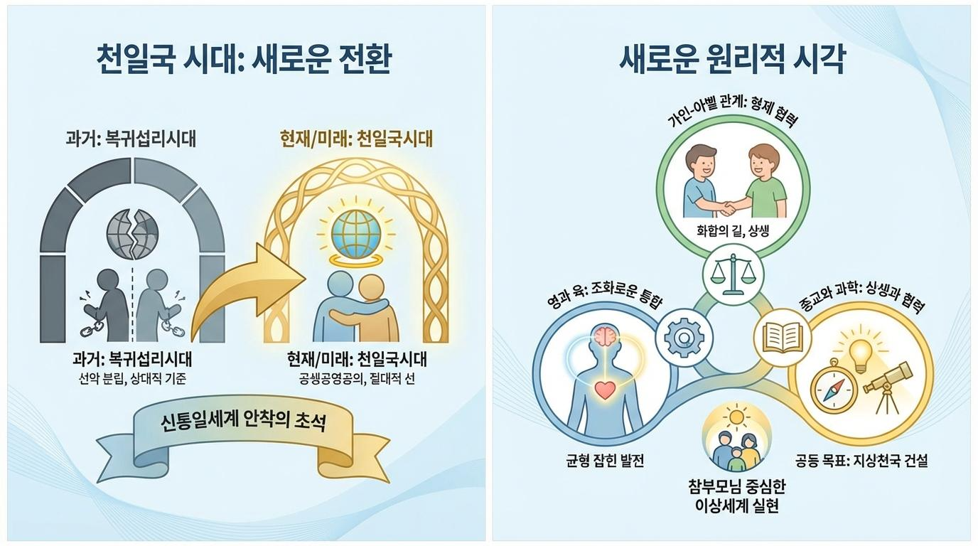 우리는 지금 인류 역사의 중요한 전환점에 서 있습니다. 재림메시아께서 지상에 오시어 이루고자 했던 이상세계, 즉 공생공영공의주의 사회의 실체인 천일국 시대를 맞이하고 있습니다. 지금까지 복귀섭리 역사를 이끌어 오신 하늘부모님과 참부모님의 노고를 통해 인류는 원죄를 벗고 새로운 출발선에 섰습니다. 이제는 신통일세계 안착의 초석을 다지기 위해, 과거 복귀섭리 시대의 관점에서 벗어나 천일국 시대에 부합하는 새로운 원리적 시각을 정립해야 할 때입니다. 특히 선악의 개념, 가인과 아벨의 관계, 영과 육의 이해, 그리고 종교와 과학의 역할에 대한 심도 깊은 재해석이 필요합니다. 이러한 재정립은 우리가 앞으로 나아가야 할 길을 명확히 하고, 참부모님과 온전히 하나 되어 지상천국을 건설하는 데 필수적인 지침이 될 것입니다.