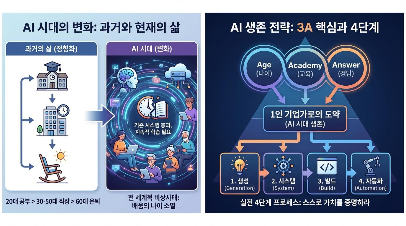인공지능(AI)이 모든 산업의 근간을 뒤흔드는 지금, 우리에게 필요한 것은 과거의 영광이 담긴 종이 졸업장이 아닙니다. 변화의 파도 위에서 침몰하지 않고 나만의 항로를 개척할 수 있는 실전적인 생존 전략입니다. 오늘 칼럼에서는 AI 시대를 관통하는 세 가지 핵심 키워드 '3A'와 이를 바탕으로 한 1인 기업가로의 도약 방법을 심도 있게 짚어보고자 합니다.