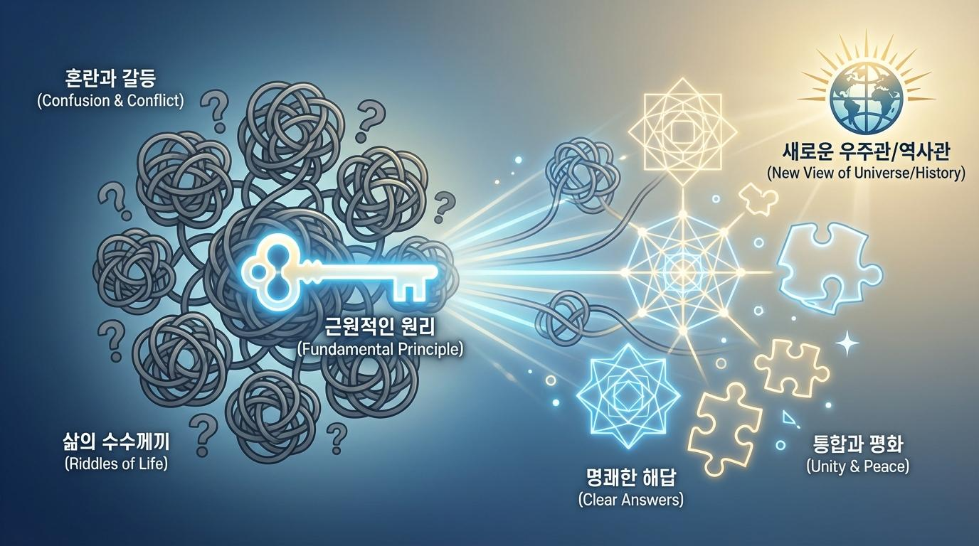 마치 복잡한 기계의 설계도를 이해하면 그 기계의 작동 원리를 명확히 알 수 있듯이, 이 근원적인 원리는 인생의 가치와 역사의 의미를 깨닫게 하는 궁극적인 해설서와 같습니다. 이 원리를 우리 삶에 적용하면 개인적인 고민과 번뇌가 해결되고, 사회와 세계에 적용하면 복잡한 문제들이 풀리는 놀라운 경험을 하게 될 것입니다. 오랫동안 인류를 괴롭혀왔던 종교적, 철학적 난제들 또한 이 원리 안에서 명쾌한 해결책을 찾을 수 있습니다. 이는 기존의 사고방식을 뛰어넘어, 우리가 세상을 바라보는 시야를 근본적으로 확장시키는 새로운 우주관, 인생관, 역사관을 제시합니다.